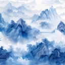 大美国风新中式青花瓷蓝色山水风景画中国风壁画 新中式壁画
