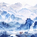 大美国风新中式青花瓷蓝色山水风景画中国风壁画 新中式壁画