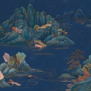 新中式中式壁画 中式深蓝色山水画 中式庭院渔船壁画 山水壁画 深色彩色山水壁画