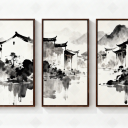 新中式中式水墨画 禅意水墨壁画 徽派建筑 徽派建筑装饰画 山水楼阁画 徽派码头墙
